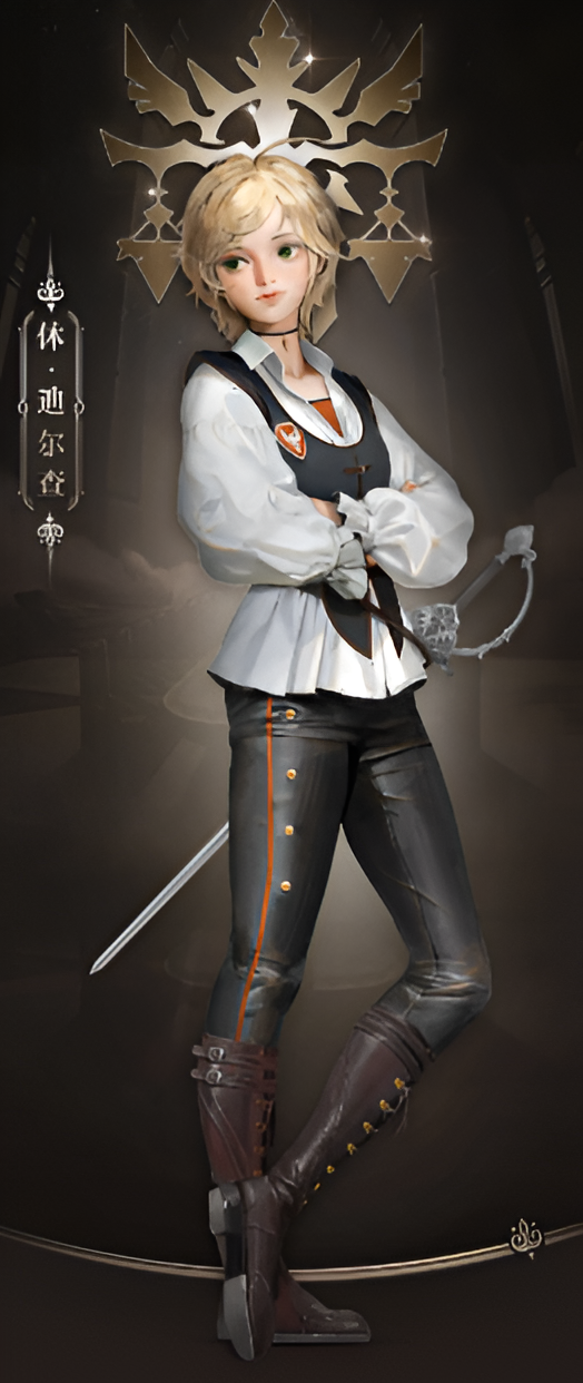 Era una mujer con el cabello rubio hasta los hombros, vestida con un traje tradicional de entrenamiento de caballero de color blanco grisáceo.