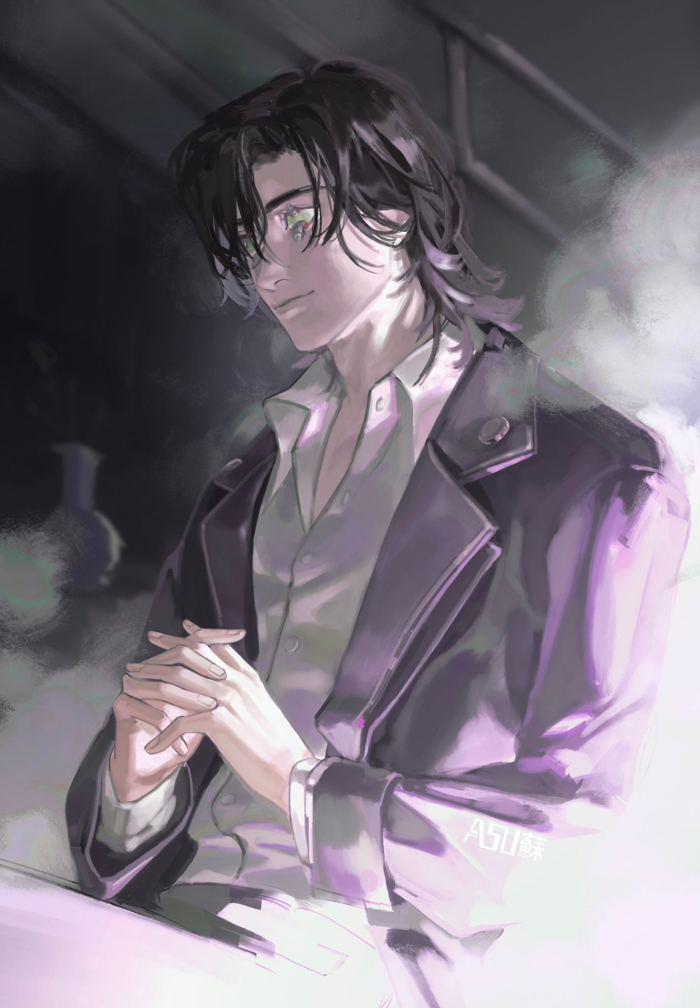 Llevaba el pelo negro más largo de lo habitual, lo que le daba un aspecto artístico. Sus ojos eran verde esmeralda, no afilados pero cautivadores. Tenía un rostro delgado y una postura relajada…